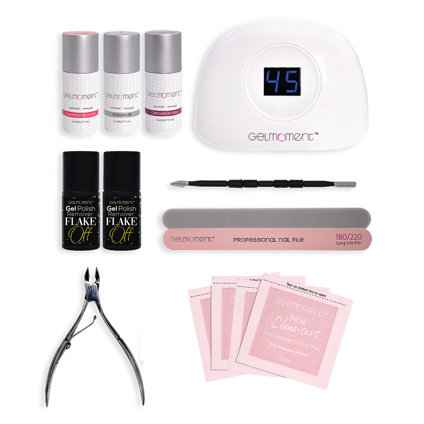 The Deluxe Customer Kit is designed for those who are comfortable in applying GelMoment Gel Nail Polish and are ready to use our Deluxe Four Finger Lamp, which works by automatic sensor!