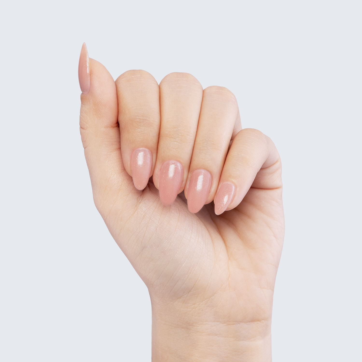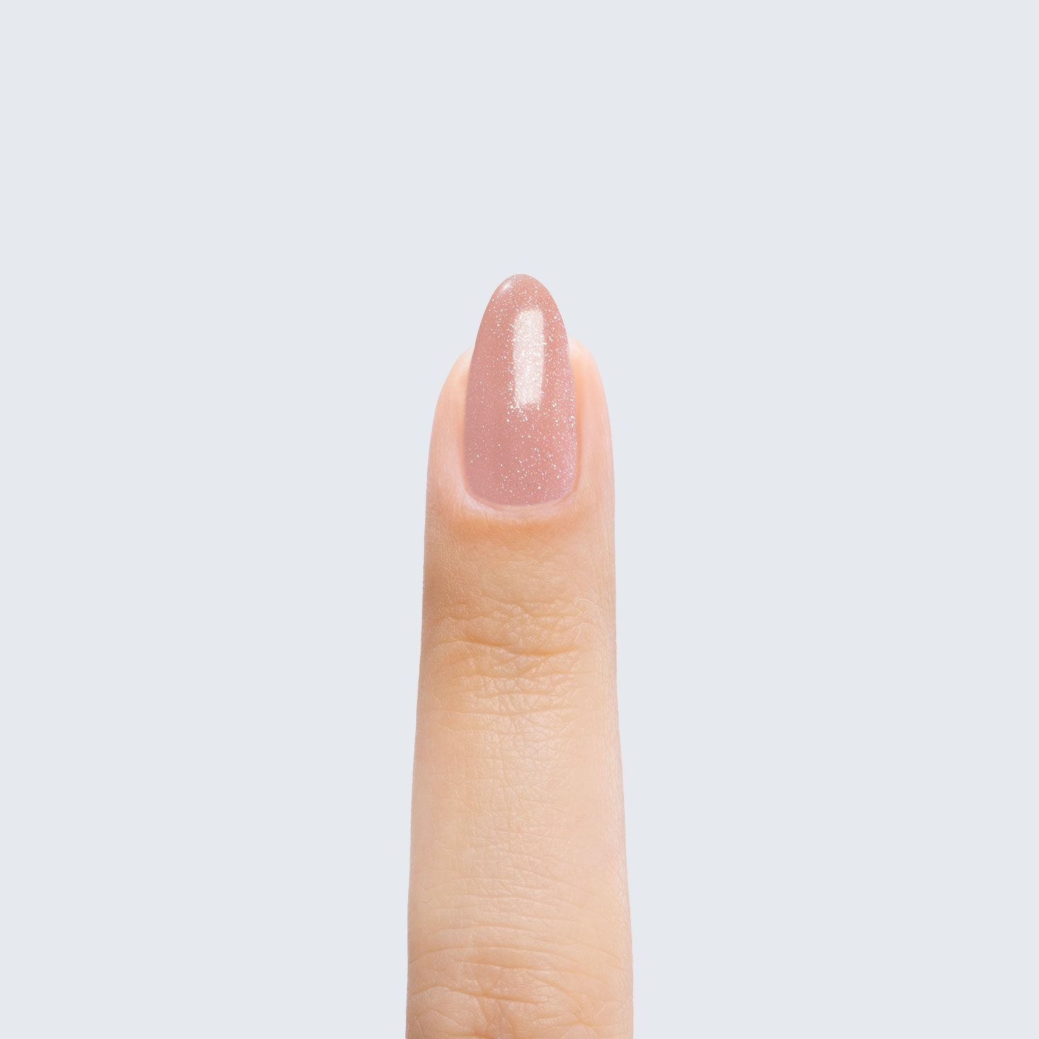 Pale pink with silver shimmer. Semi-sheer. Semi-matte finish. Warm undertone.