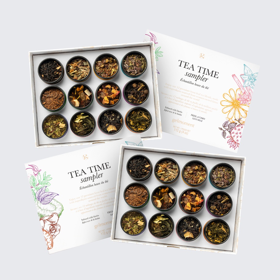 Discover your favourite of our 12 premium loose-leaf tea blends with gelmoment's NEW tea time sampler box. Our teas are all made from ingredients that we proudly source from women-owned farms around the world. Plus, our delicious blends are free of GMOs and infused with biotin, making them an eco-friendly beverage that also helps nourish your skin, nails, and hair.